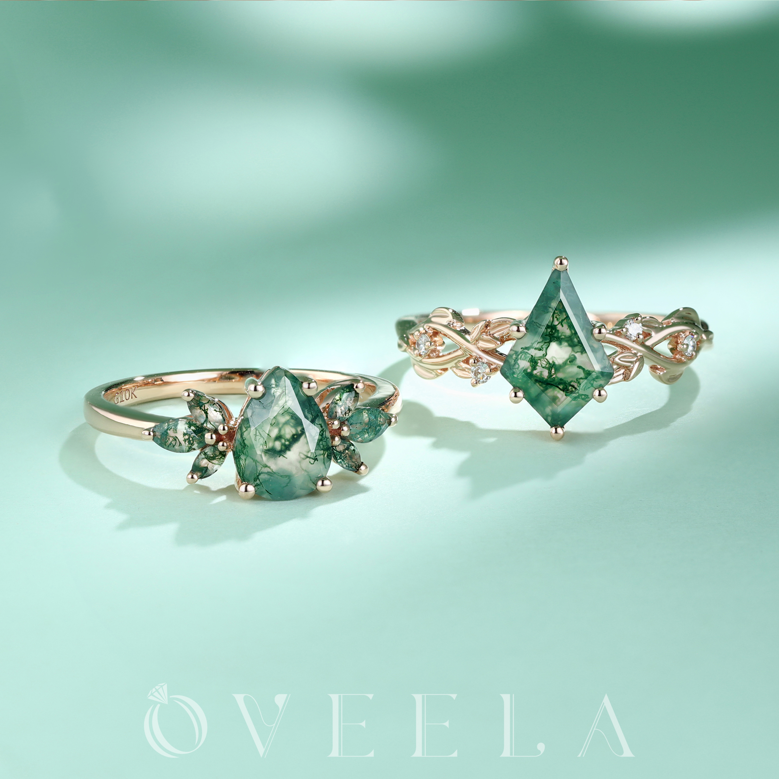 Leaf Nature-Inspired Pear-Shaped Moss Agate Ring in – Unique Engagement Ring for Women