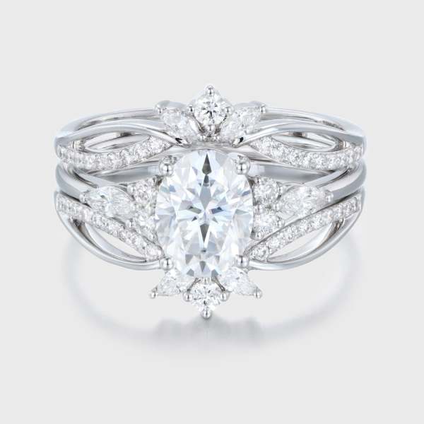 Oval Cut Lab Grown Diamond Engagement Ring Set – White Gold Double Band Bridal Ring Set